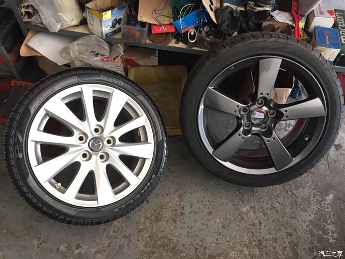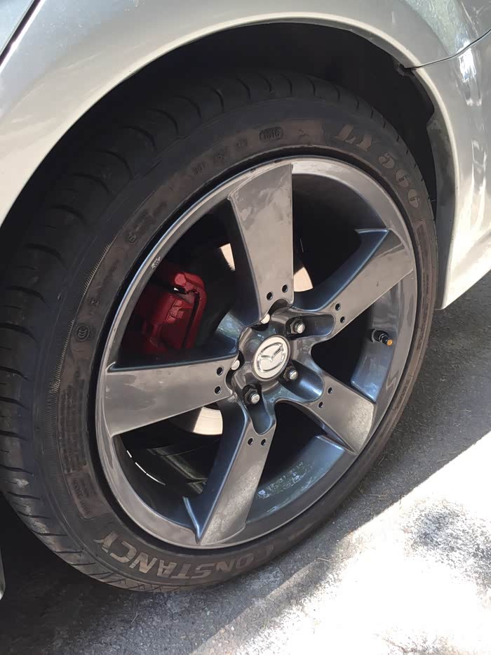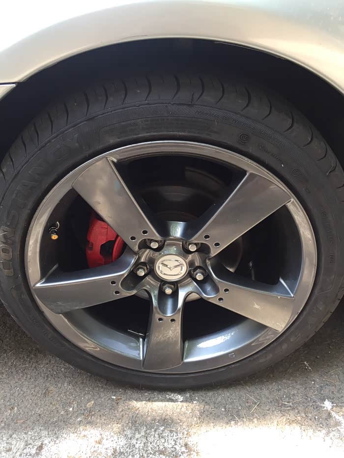 换了N套轮毂(前面都有帖子),用来用去还是喜欢RX8的感觉,姿态,数据,所以苦心海淘了这套RX8轮毂回来,成色极品(同行帮忙搞回来的),改了枪灰色,动平衡完美,为了兼顾舒适所以上了225 45 18(其实225 40 18更贴近原厂数据),因为二胎刚出生半个月。换完后,那叫一个称心如意,轮毂定型了