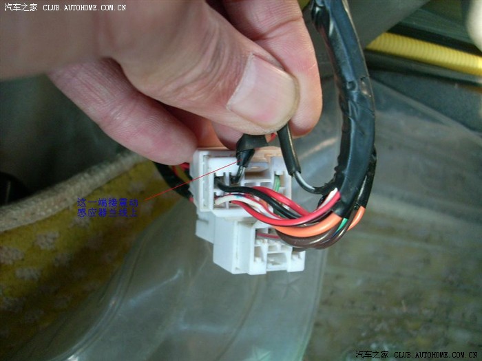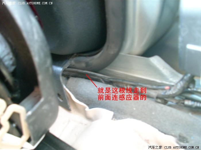 感应器的线从门下扣板走到副驾驶前手套箱下,注意,感应器一定要用双面胶要粘到车架上,这样反应才灵敏,它主要是靠车身震动来触发信号的。