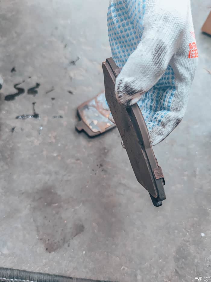 我说刹车怎么开始有点吃力,这刹车片都快磨完了,这原厂刹车片一边高一边低,最多也就多用个几百公里可能磨没了