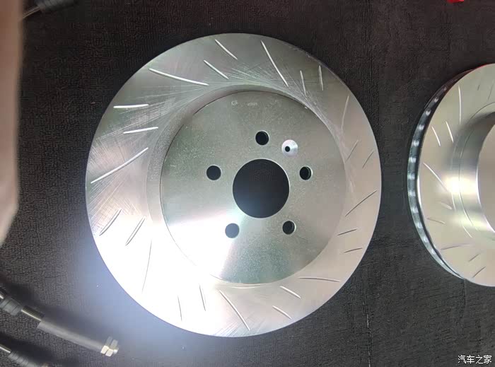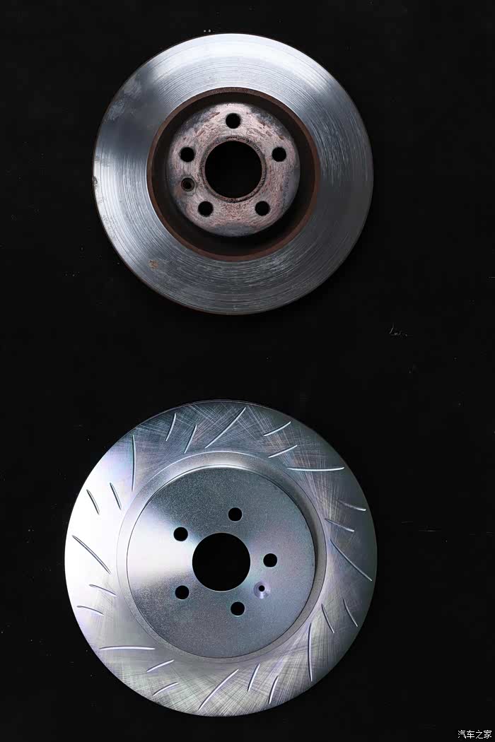 原厂刹车盘跟升级一体盘的对比,原厂刹车盘为322规格的碟盘,升级的为355规格的碟盘。