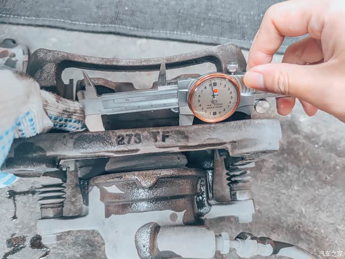 这边测量的活塞缸尺寸约为60,根据圆的面积计算公式πr²推算下来,3.14*30²=2820,由于这是浮动式卡钳,所以还要X2,这么下来原厂的活塞面积为56.52CM²,