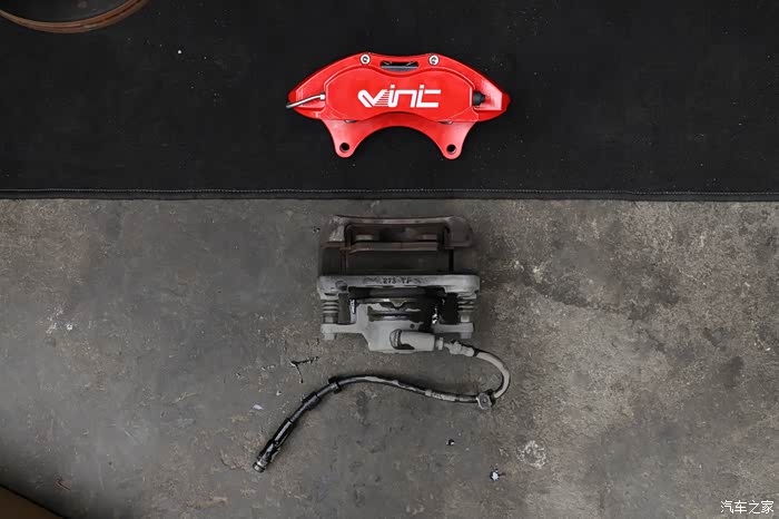 升级的VINIC专用卡钳,属于对向式四活塞。原厂的是单边单活塞浮动式卡钳。升级后的这个卡钳脚感上理论上反应应该更快,更线性些。