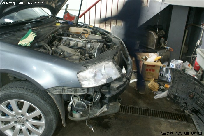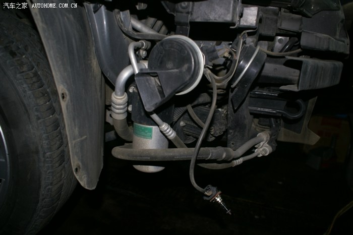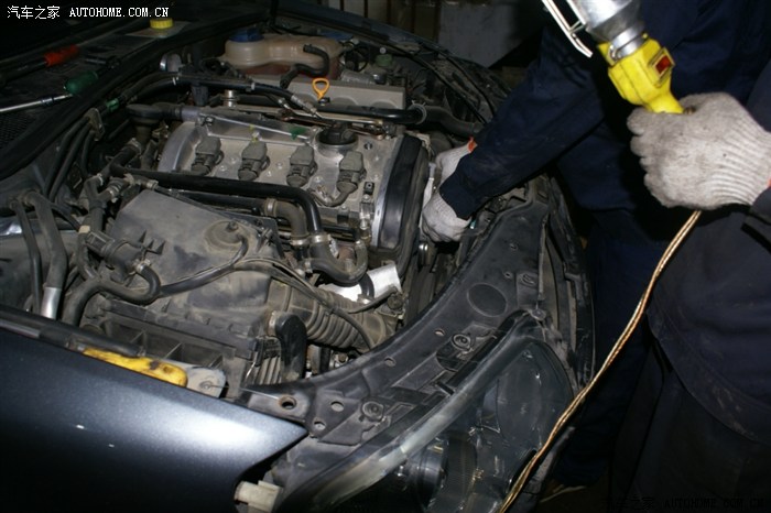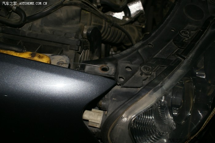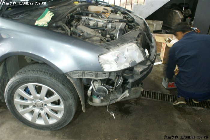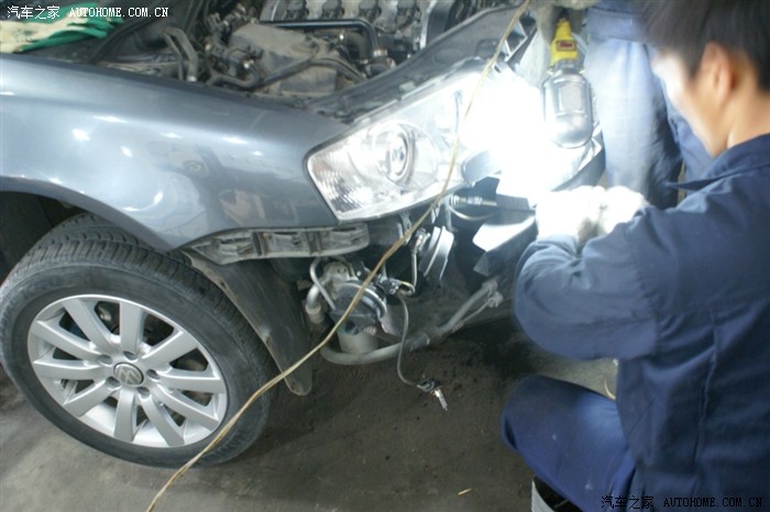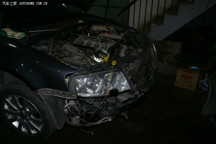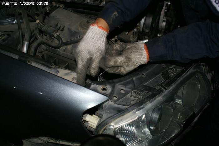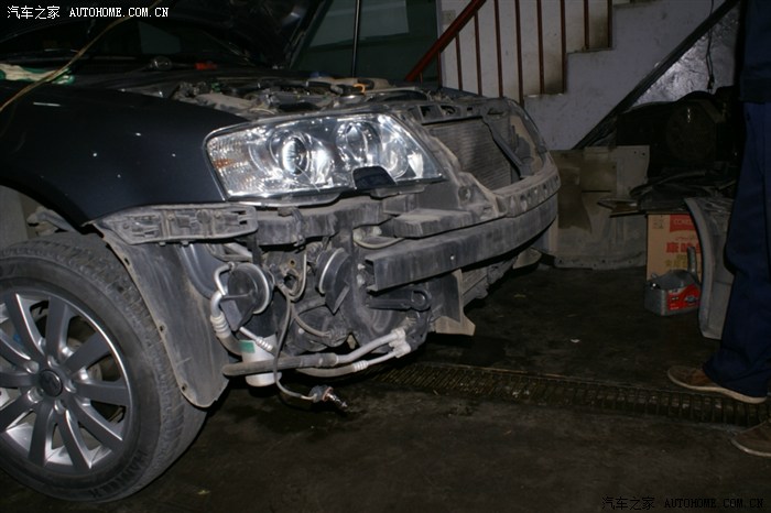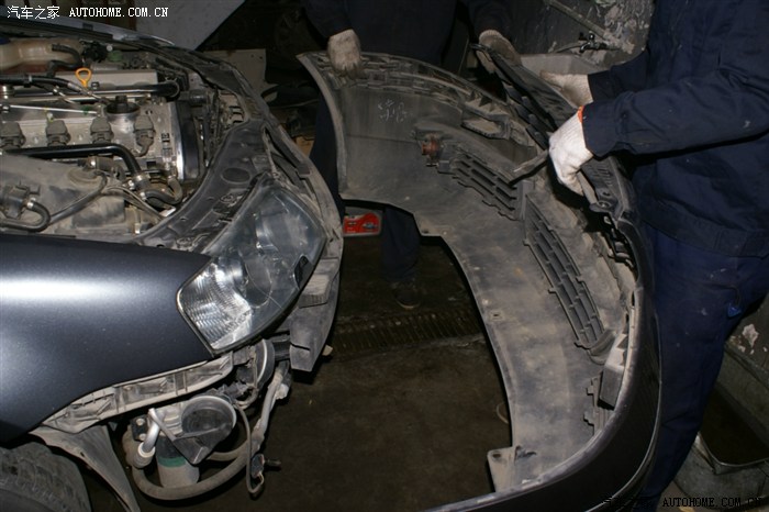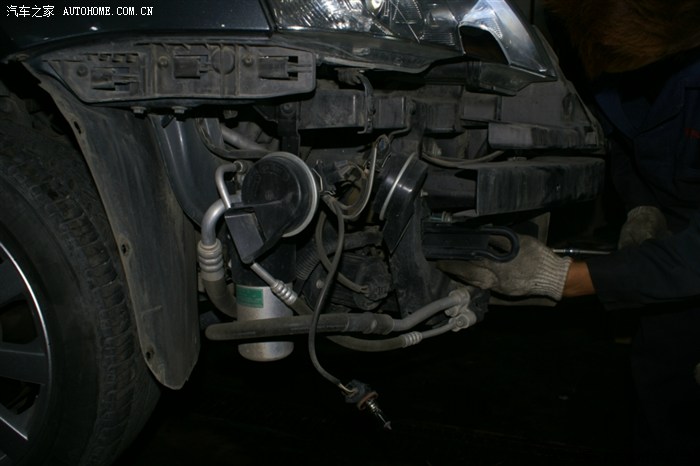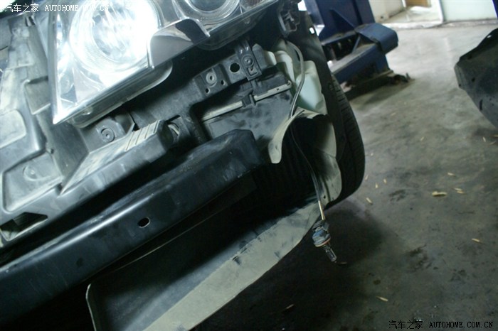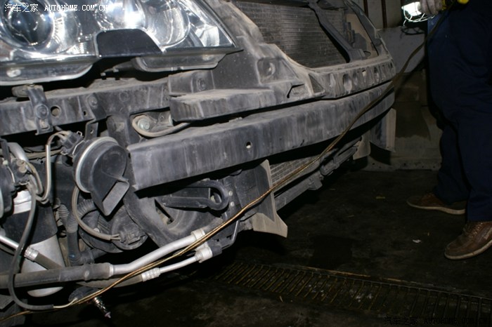 看到大灯的缝没,就把前杠卸松后放到这种程度,并没有全部拆下来,以后的操作也就是在这种状态下操作的,师傅说了,十个人十种干法,这种干法不用拆各种管路,但要相当熟练,从后面操作看,师傅真的很熟练,因为这种操作对零件位置螺栓孔要相当熟悉