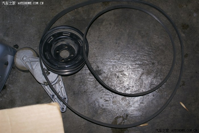 拆下来的发电机皮带张紧器,皮带轮,皮带小的是空调皮带,共用一个大皮带轮