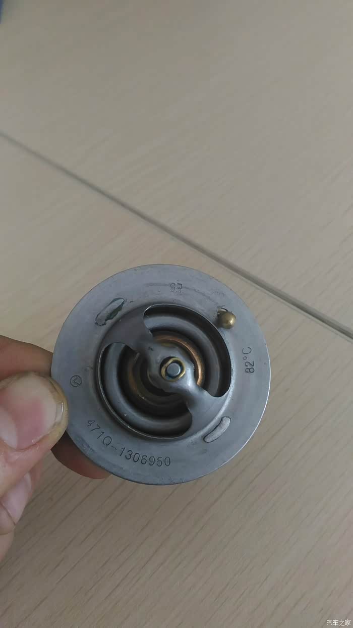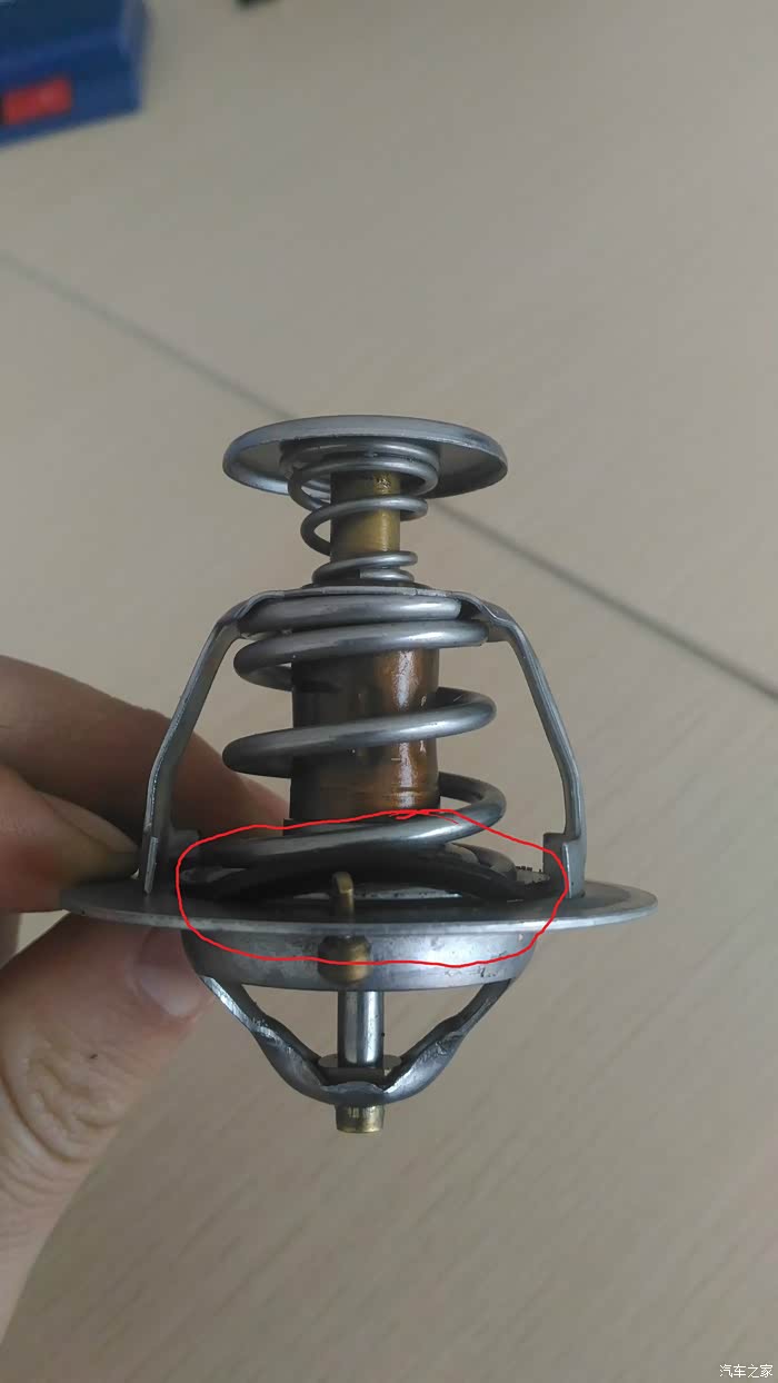 启动车 稍有温度后 看看回水管温度 有温度的话 那就是节温器的问题了。看看我拆下原车的节温器吧 密封胶垫脱落 封水不严 形成大循环 水温肯定就上不去了。