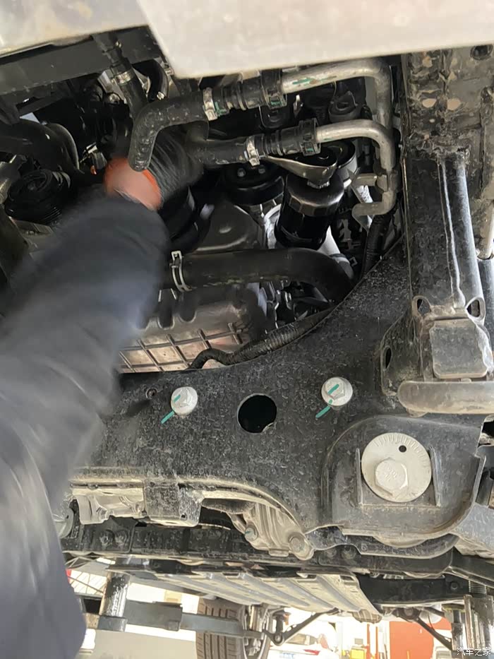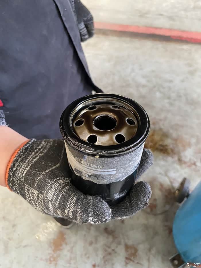 拆解机油滤芯,这个滤芯设计的太高了,且是斜的不太合理容易滴油到其他部件,师傅给挡了一滴没漏