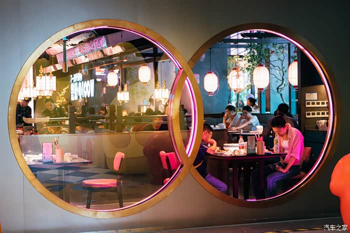 我们选择了二楼的位置靠近这个圆形的玻璃,刚好可以看到内部商场的情况。