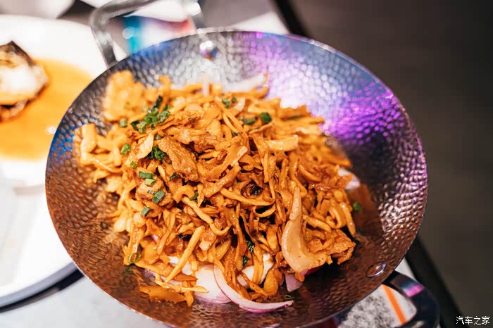 干煸嫩笋片,这道菜个人觉得有些不合胃口。地下铺垫的是生洋葱,会有比较呛人的味道。如果可以炒至一下,洋葱反而是点睛之笔。里面的肉片还可以再油锅里炒至一下,炒出多余的油脂会更加香。看到这道菜,让我想起大学旁的小餐馆里面的干锅花菜,越煮越香,最后的洋葱吃起来也会有一点甜味。