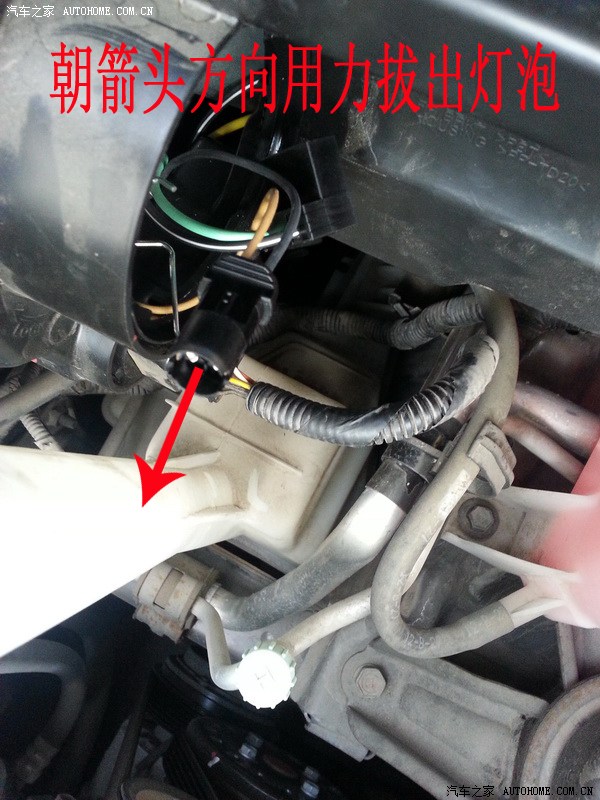下图示意:首先拔掉灯座,然后按住弹簧卡子的一头先往下按再往边上一拨,弹簧卡子就打开了,取出旧灯泡,换上新灯泡,要注意灯泡的底座有个突出来的地方要对准灯座上的缺口,最后把弹簧卡子按原位别好。最后盖上后盖,完成!