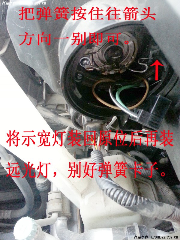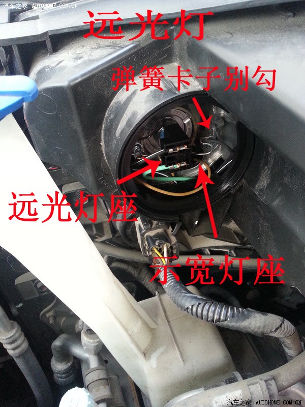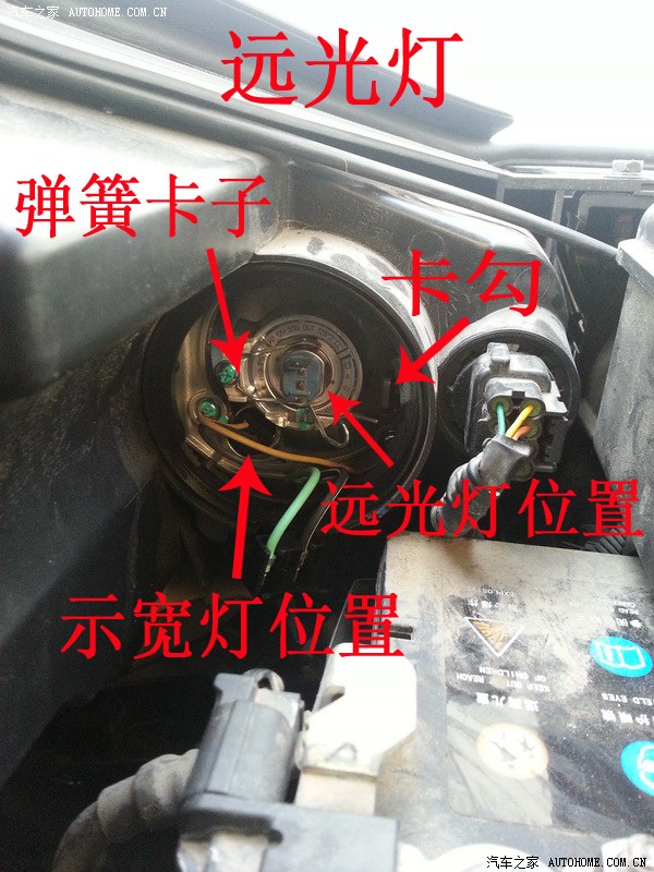 下图是左侧的远光灯打开后盖的示意图,可以很清楚的看到各灯的具体位置,弹簧卡子的位置,卡勾的位置。便于各位的操作!