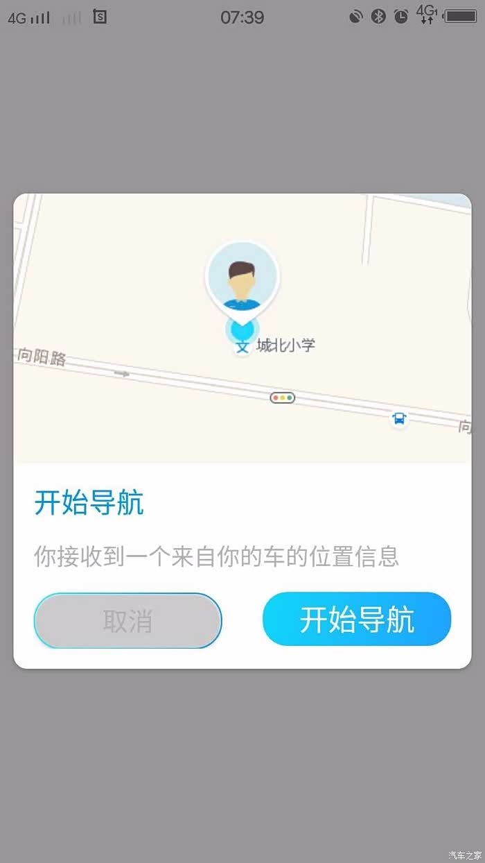 当我们把目的地输入之后,App上会自动弹出你所输入的目的地,在目的地的最右边会同时出现一个按钮:“发送到车”,到我们点击发送到车之后,车机上便接收到一条消息“你接收到一个来自你的车的位置的信息”,并且“开始导航”按钮同时高亮,这个时候你如果点击:“开始导航”,那么就可以实现通过车机导航系统进行导航了。