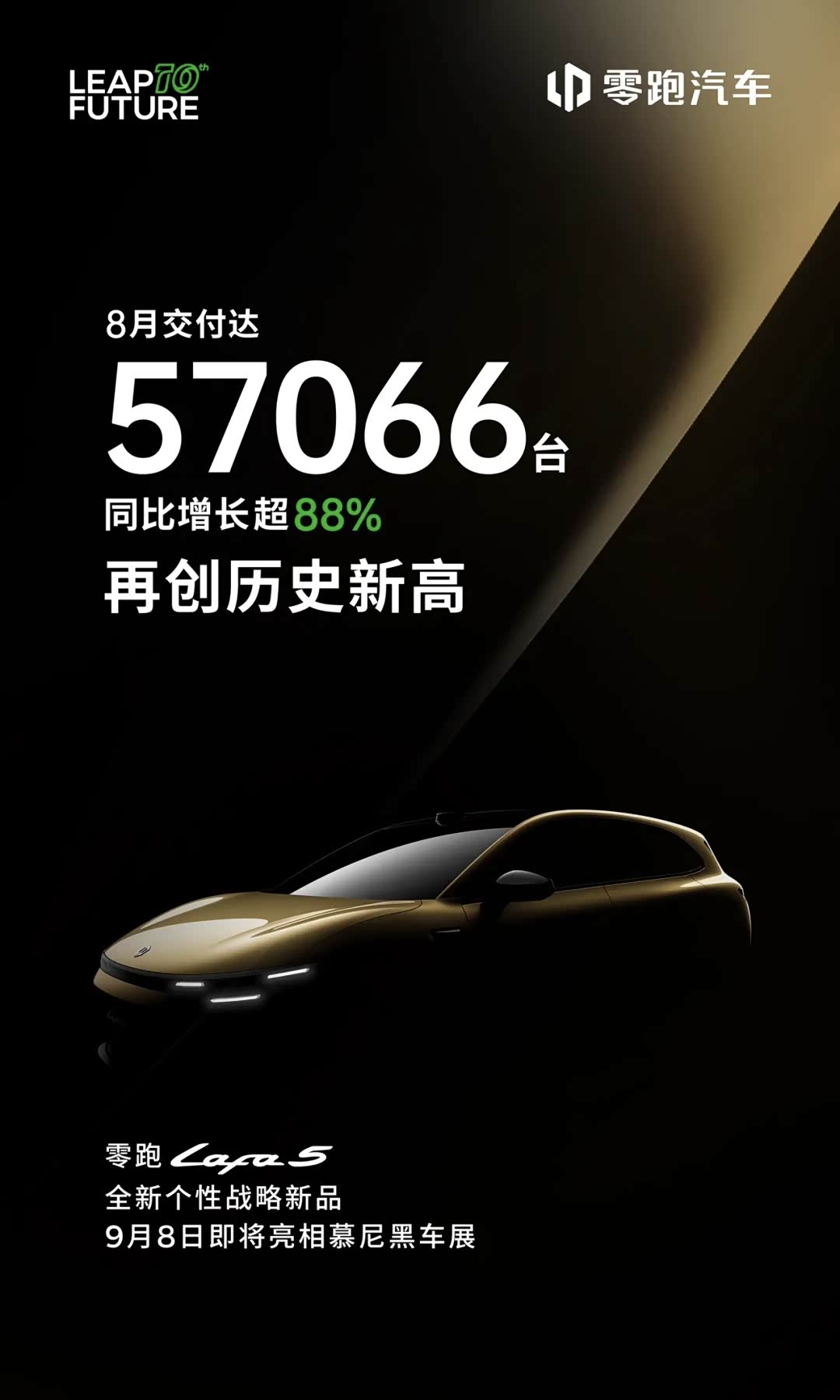 ✅️如今,零跑已经连续五个月稳居中国新势力品牌月销量榜首,7月销量首次突破5万台大关,8月第四周更是以1.21万辆的成绩蝉联周冠军,8月份销量又创新高,达到57066辆,继续领跑新势力。