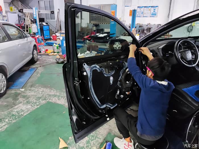 自己找了个汽修厂改的,改装玻璃时模仿亚洲龙和冠道,在门板第一层再加一些止震板贴,四个门用一张止震板就可以了,不用铺满。
