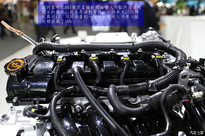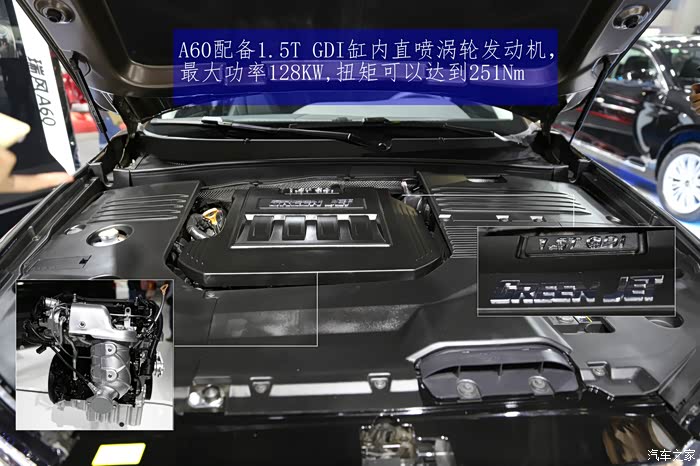 A60的发动机舱非常整洁,分布也合理,中间是1.5T GDI的发动机,两边分布这防冻液,玻璃水壶和刹车油,电瓶等等。现场的展台上也展出了这台发动机的全裸形态,让各位观众可以全方位的来了解这台中国自主的白金动力发动机。
