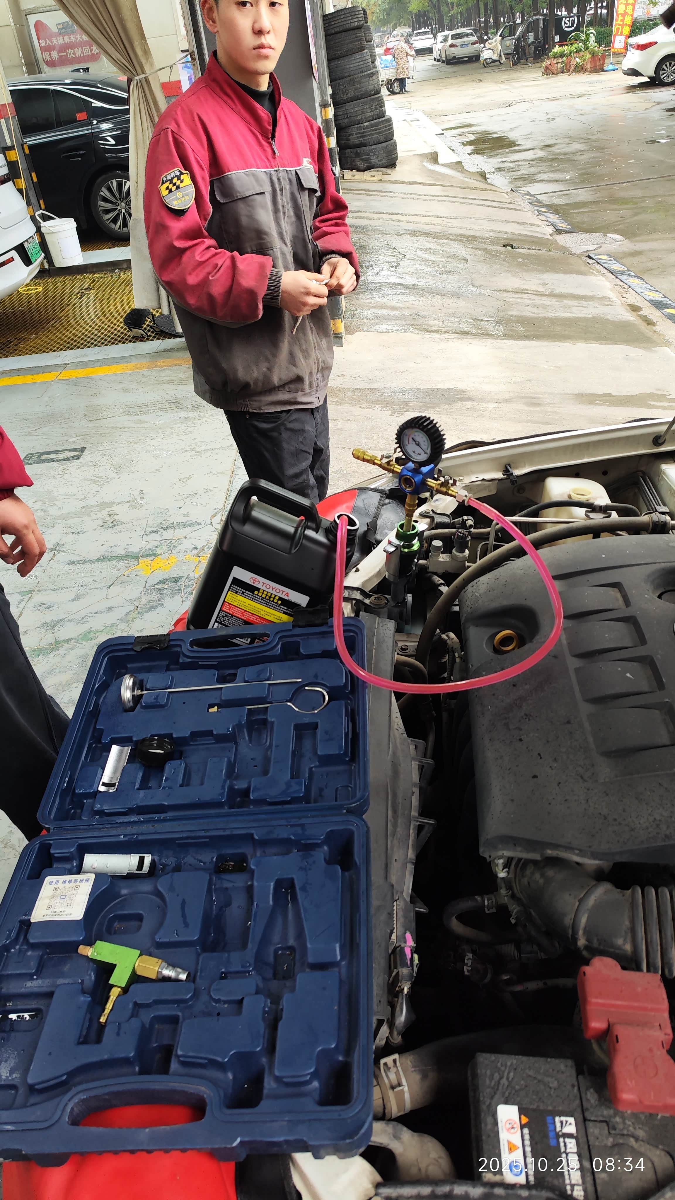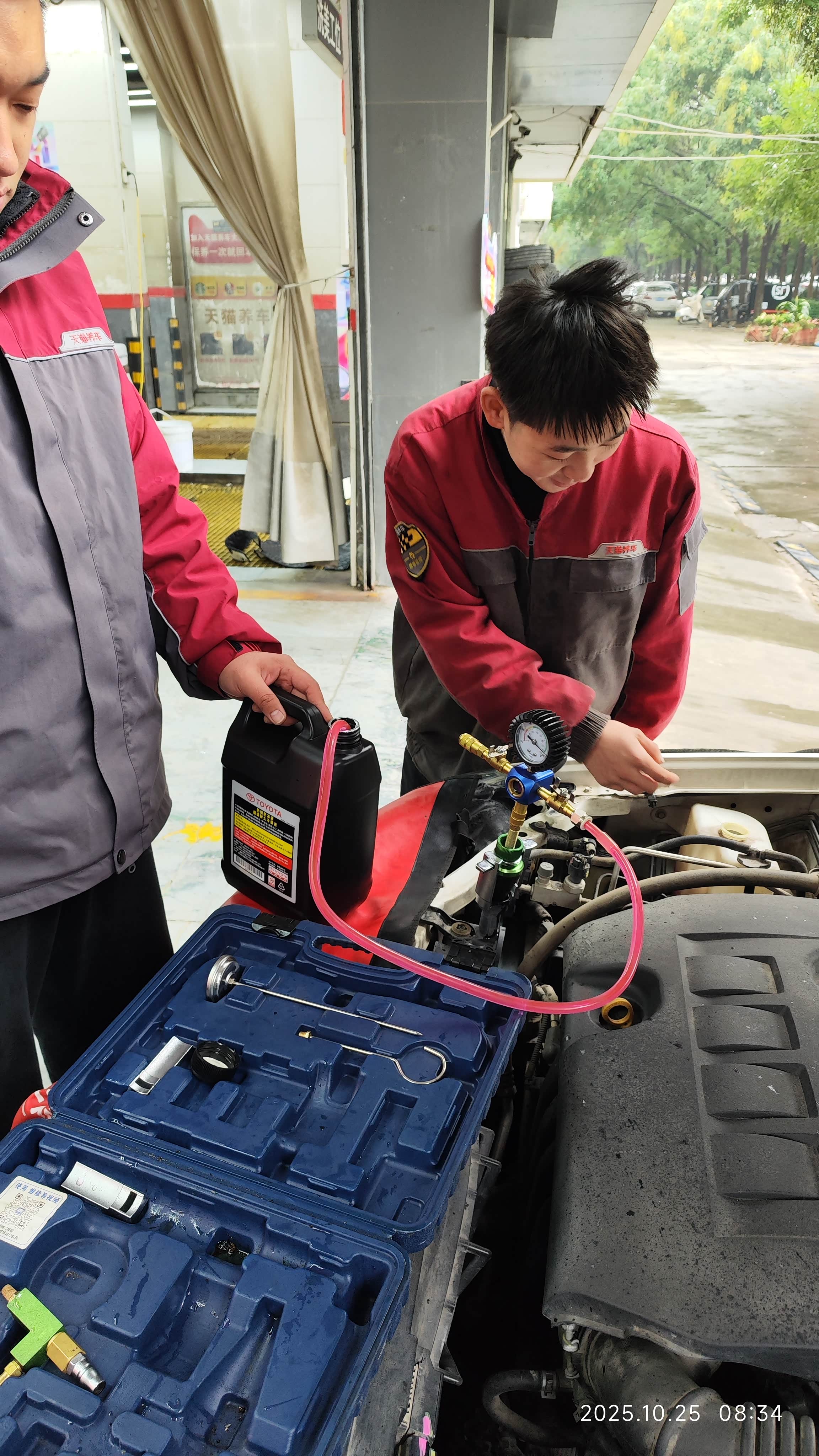 天猫百亿补贴买的丰田原装防冻液,买了一大桶4升,两个1升的,总共6升,今天一早去天猫养车去换了,放防冻液直接原地放的,也不多,从放出来的防冻液看颜色有变淡,而且有味道,再就是色彩不均匀,感觉水多,最后拆的副水壶倒出来的,副水壶以前少了填的是冠军牌的,换防冻液就是因为添加的不是原装的,公里数和时间都到了,还有就是夏天风扇转的特别多,想想换,要对车好一点,