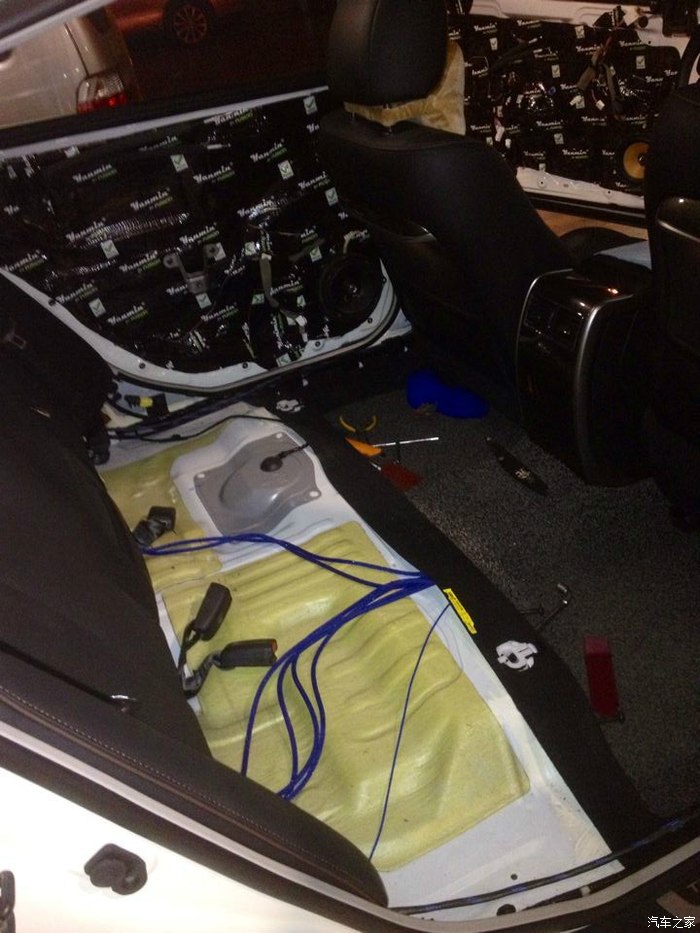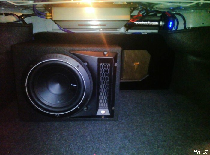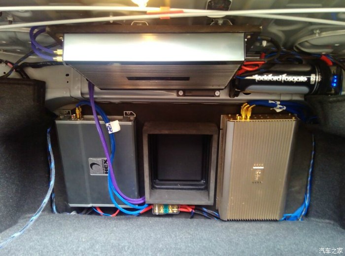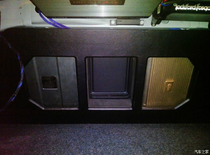 2台功放在后排座椅被上..一台推重低音,一台推高音跟前门喇叭.