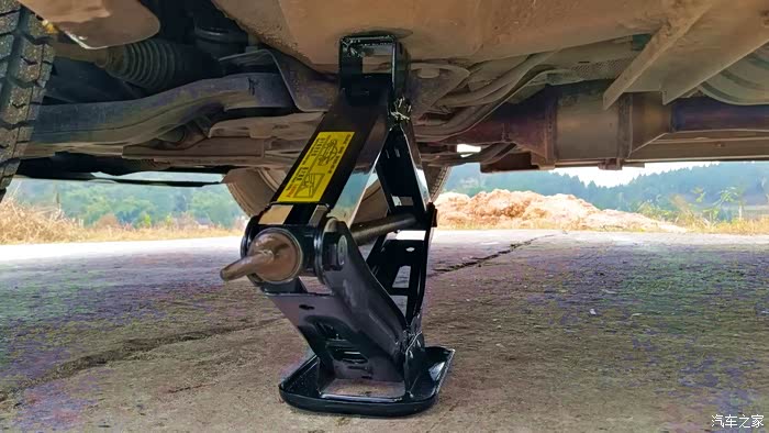 由于SUV的底盘比较高,所以在放千斤顶的时候先用手把千斤顶稍稍拧高一点。