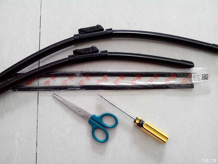 2:拆卸掉的雨刮和待换的胶条,剪刀和螺丝刀