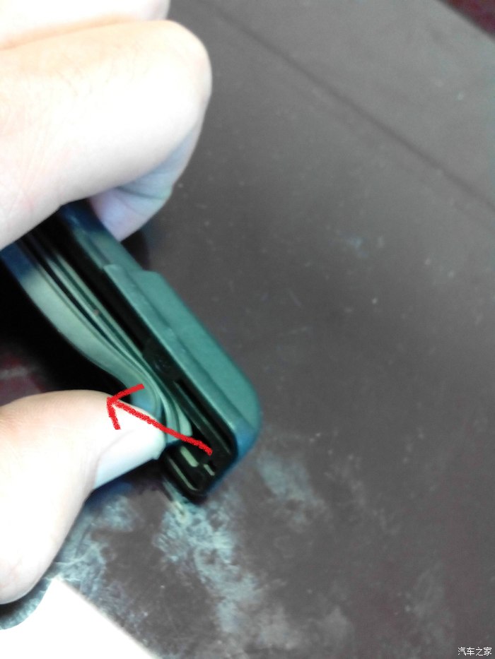 6:一端的卡扣卸掉以后,暴露出弹性钢条,此时只需要将新的胶条沿着钢条的夹缝推入即可。其实完全推入并不容易,尤其是第一次更换胶条的雨刮,中间的位置非常的紧,可以在中间的位置滴上一些洗洁精,洗发水之类的有润滑功效的东西,或者用螺丝刀把中间的缝隙轻微的扩大一点,抽拉几次,充分润滑后就一杆到底了,为啥觉得的这段描述很邪恶呢