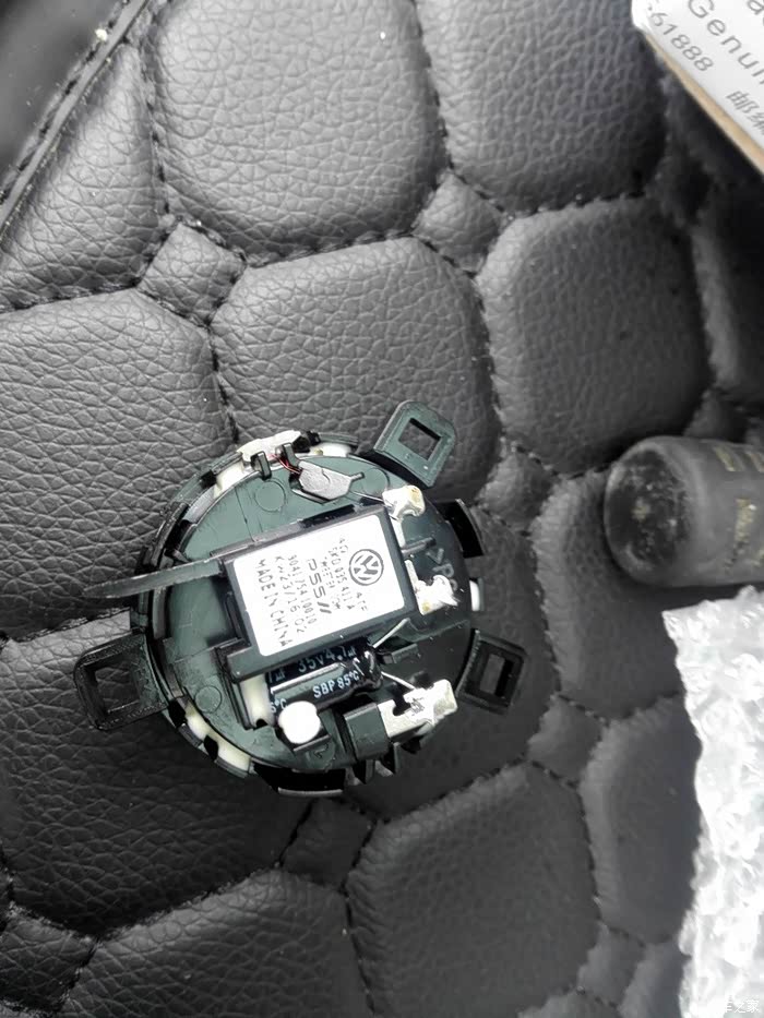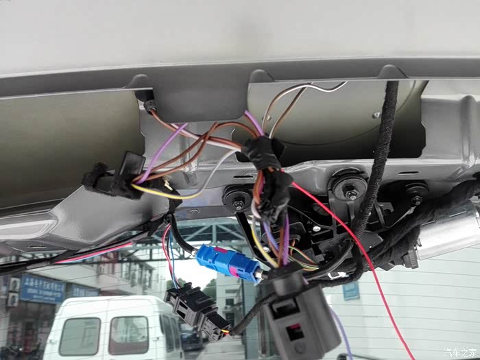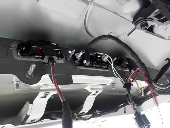 这张图是行李箱盖内部手扣背面的特写,安安的2个后尾灯和尾门手扣是一体化设计和集成供电的,而之前看到的途观RGB手扣是独立设计的,所以换装途观的RGB手扣后,原来的零件就不能用了,必须换用2个独立的牌照灯,同时将集成供电转化成独立供电,而且由于手扣尺寸不同,需要将中间手扣位置的孔进行扩孔,扩大到可以将RGB手扣塞进去才行。