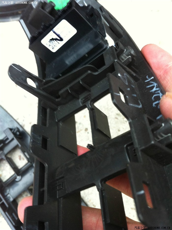 下图是新的,刚开始装车窗升级开关的时候怎么也按不下去,后来发现新的这个中间有一根小塑料,低配的这个小塑料是给掰掉了,果断掰掉。仔细看看,四个空中间的小塑料杆