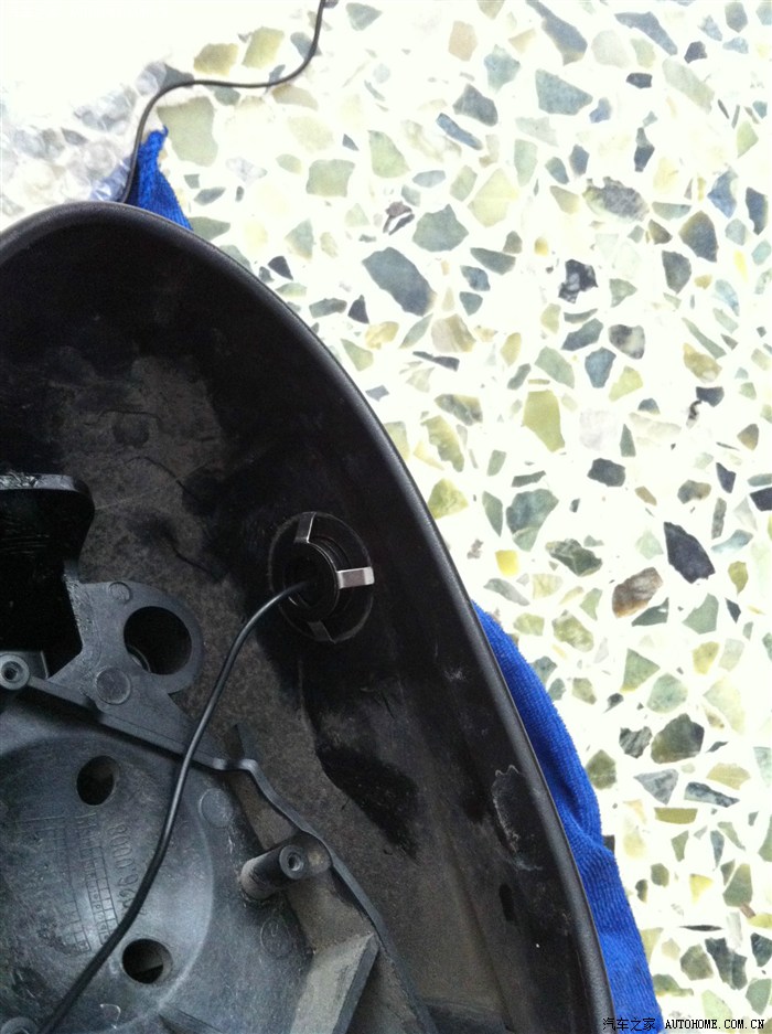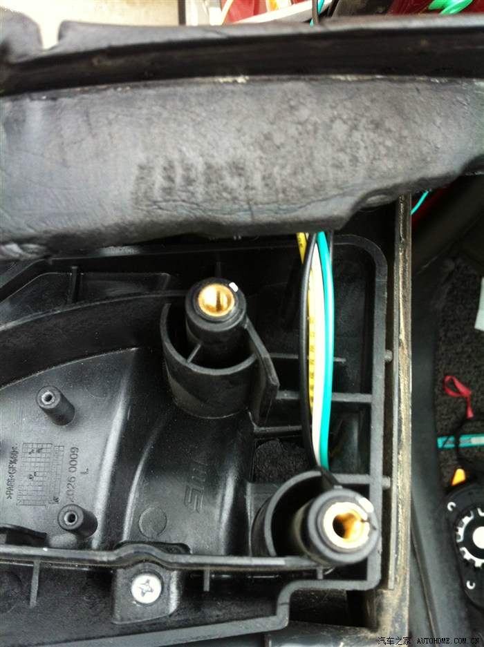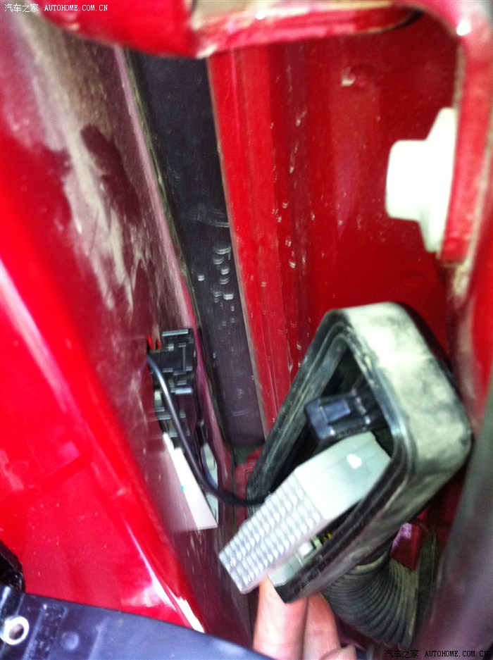 根据最上面的图,这里三根马达线和一根电加热的正极线插入对应的插头。我这里多了一根摄像头的线,咨询瞬间后果断从皮套这里穿入车内。拆下手套箱就可以看到插头后面有一个孔刚好能把线穿进去