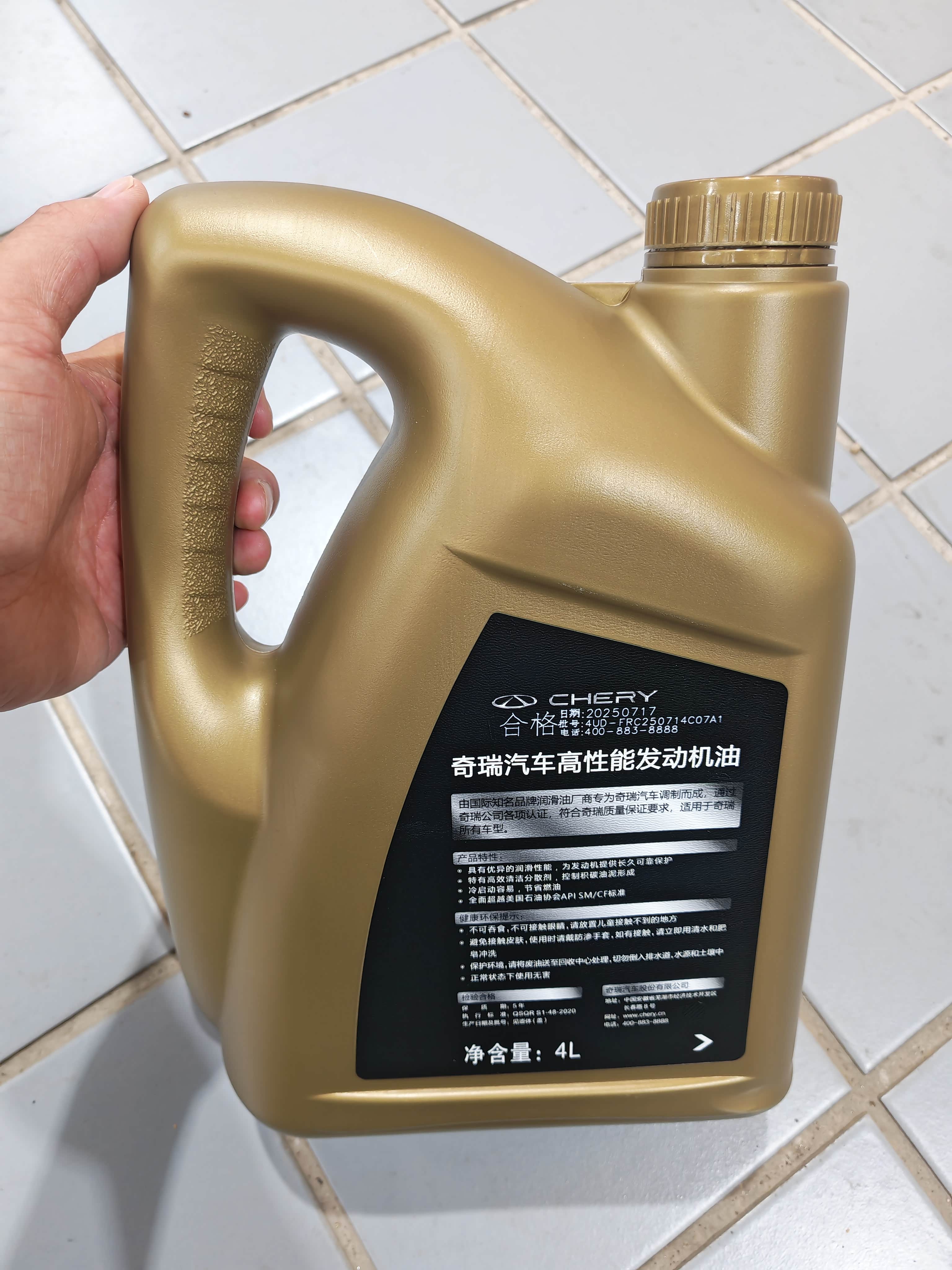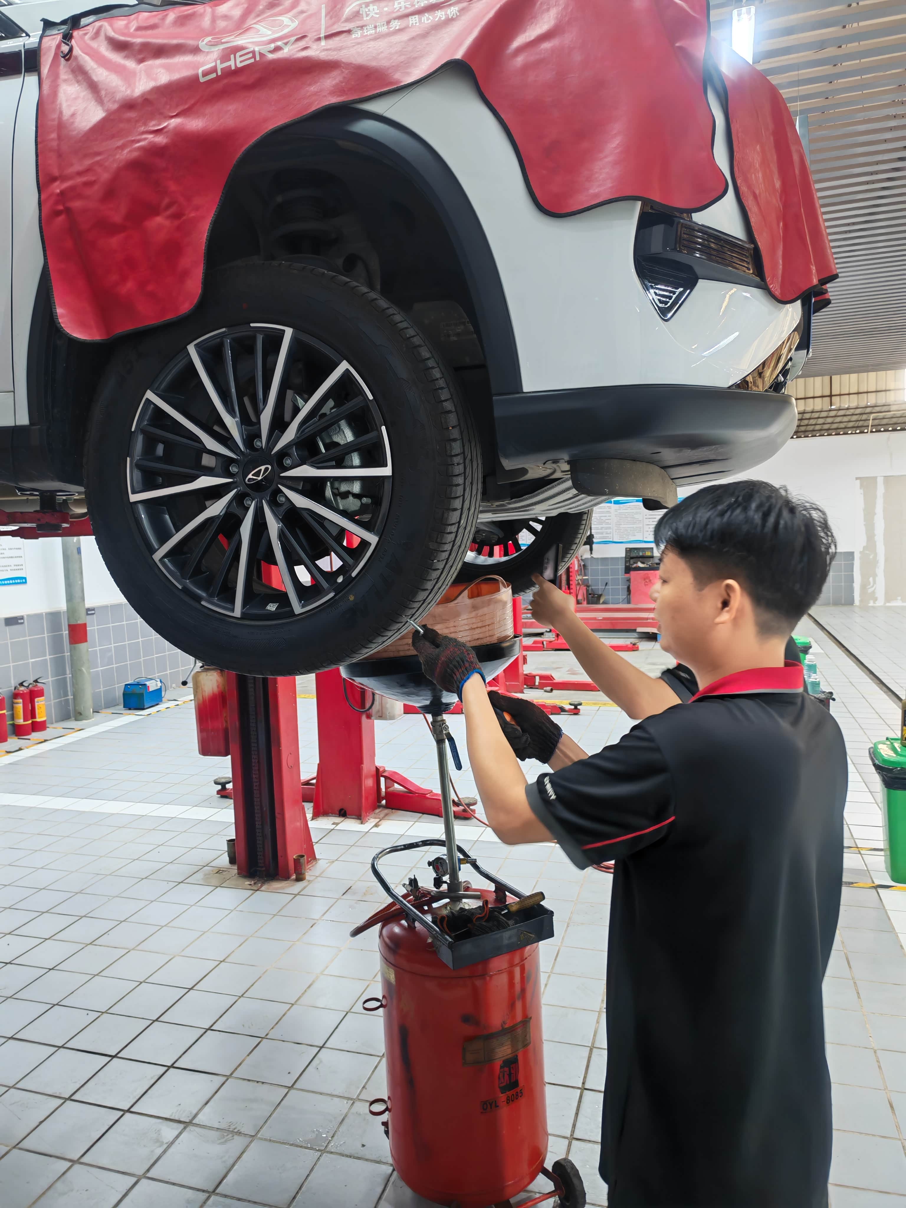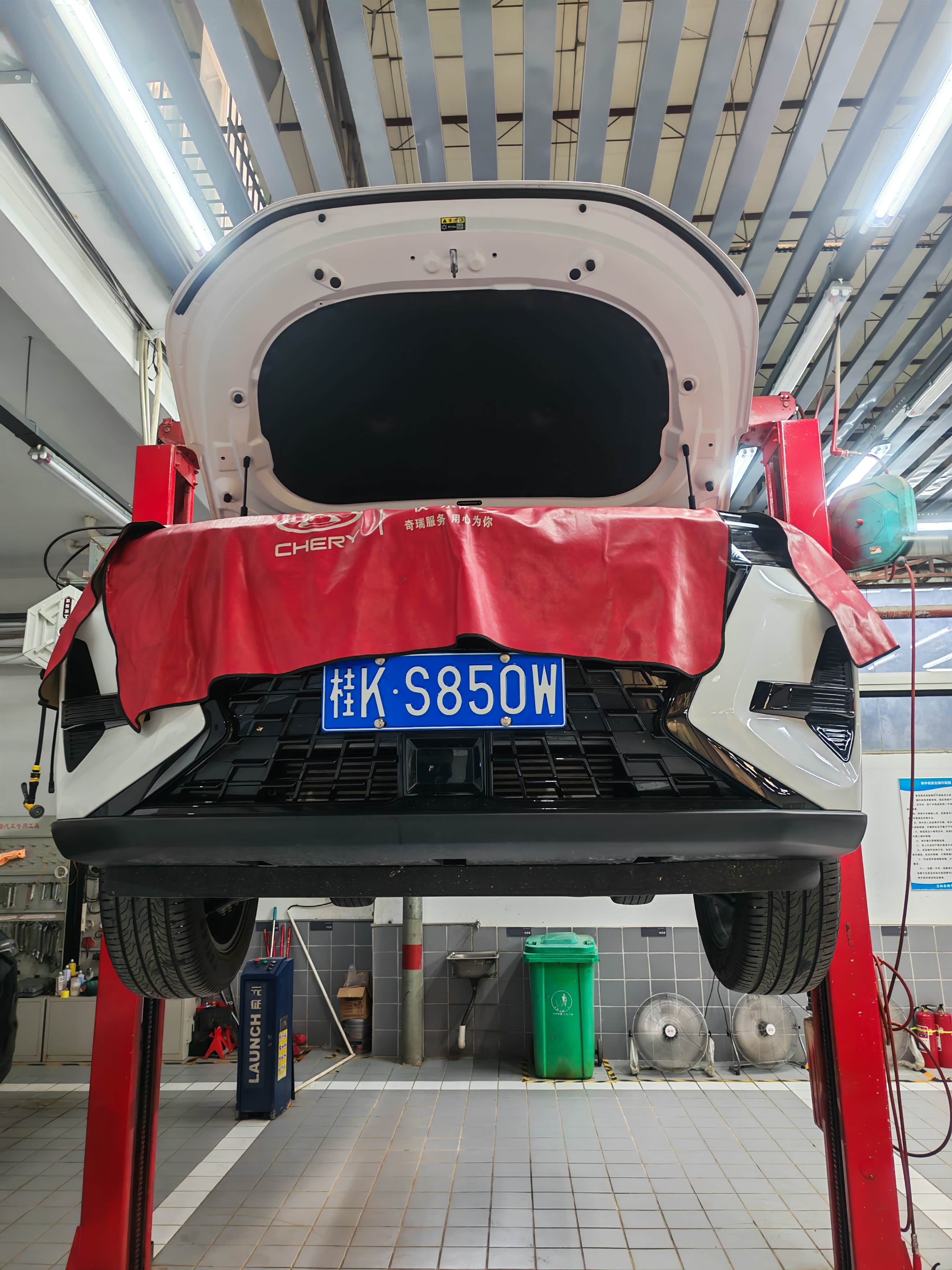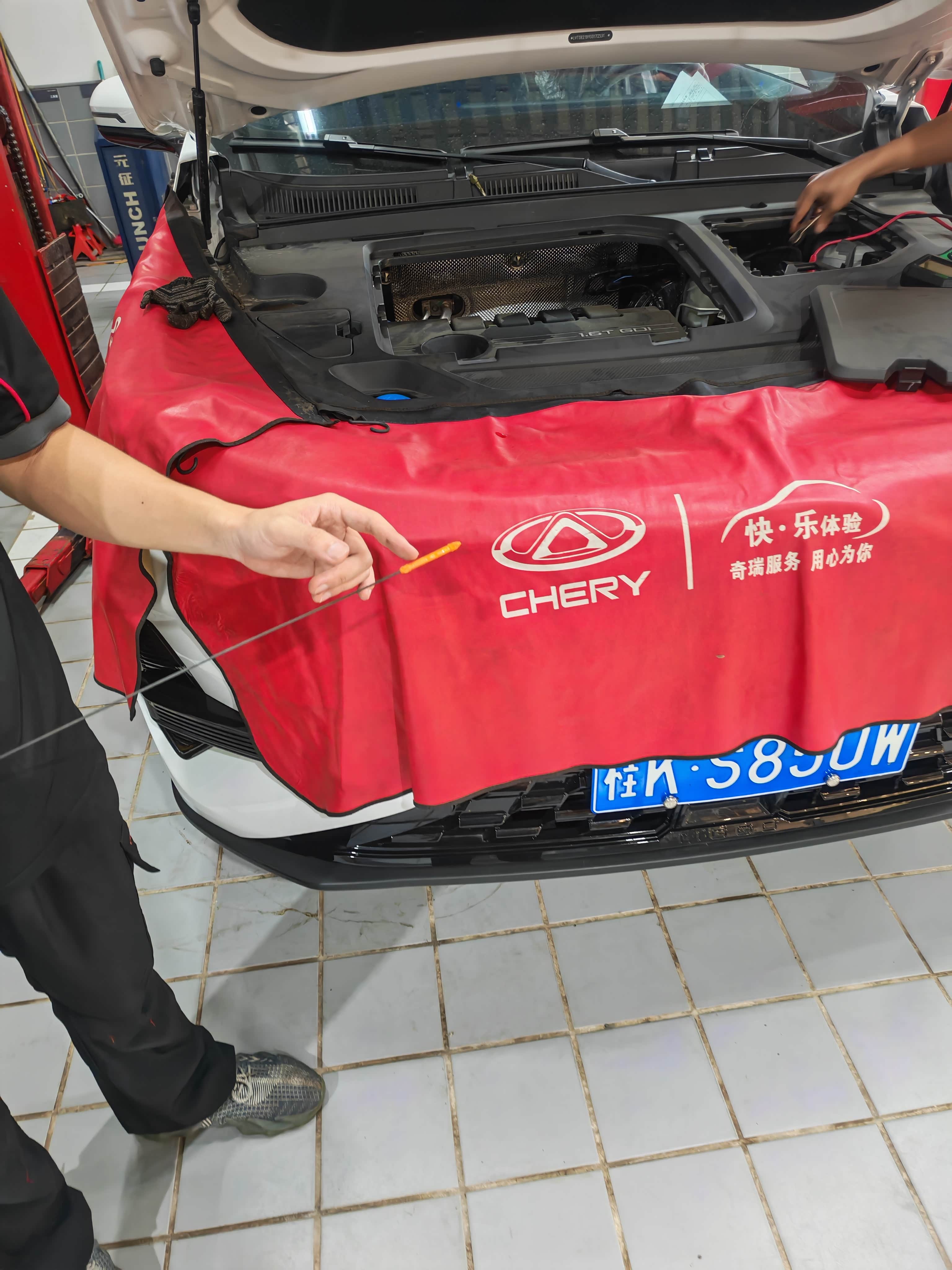 首保免费换机油、机滤,加的都是奇瑞原厂货,我瞅着瓶身就踏实。师傅先把车升起来放旧机油,顺手还清理了轮胎缝里的小石子,我还凑过去试了试清石勾,确实好用。