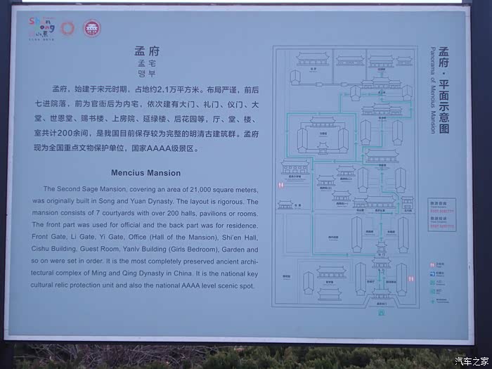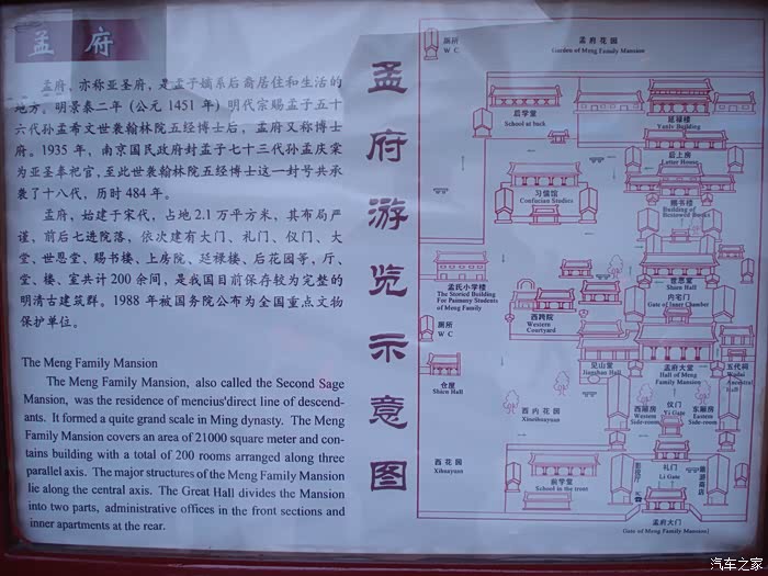 山东邹县现在称为邹城,简称“邹”,古称“邹鲁圣地”是中国历史上著名的思想家、教育家孟子的诞生地,素有“孔孟桑梓之邦,文化发祥之地”之美誉,现为国家级历史文化名城、新兴能源工业基地、中国优秀旅游城市、国家级旅游名城。三孟是指孟庙、孟府、孟林。其中,孟庙是祭祀亚圣孟子的场所,孟庙以亚圣殿为中心藏有很多珍品。孟府是孟轲嫡系后裔居住的宅第。孟林是孟子和其后代子孙的墓地,是一处保存时间长、较为完整的家族墓地。山东自驾游,其一个主要目的就是要到邹县孟子的故居看一看,毕竟孟子的母亲——仉氏,乃我的祖姓,亦算是寻宗吧。