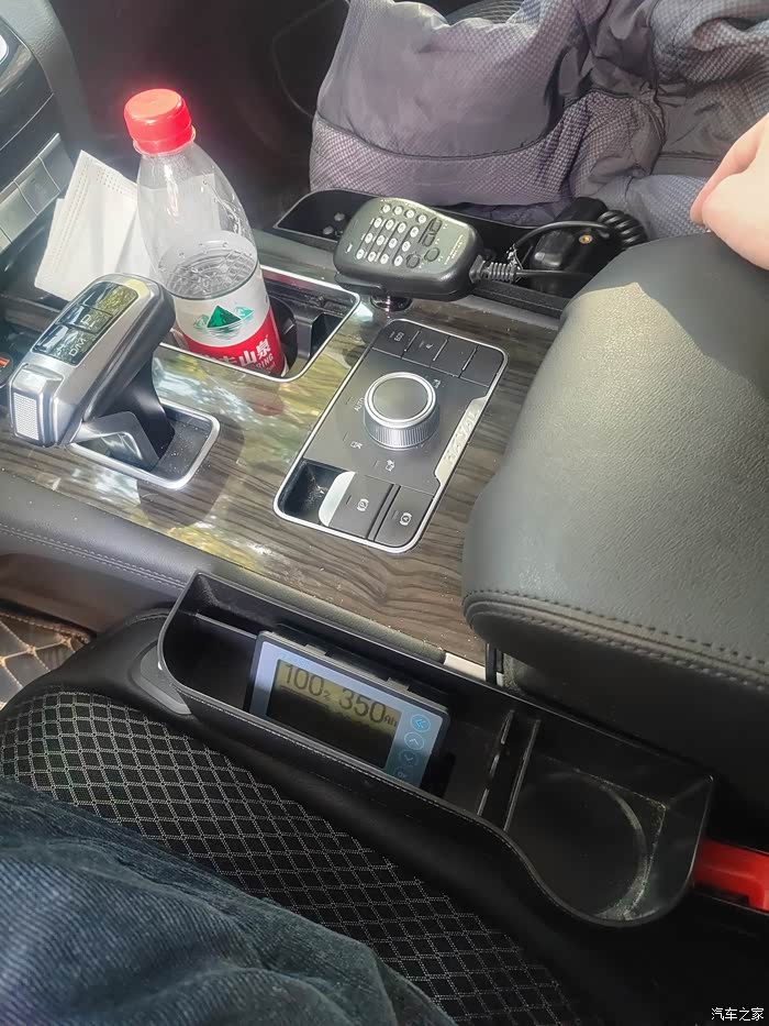 4,连接完的样子,外接库仑计由于长度不够,放驾驶台够不到。于是放扶手箱位置,正好有杂物盒,看起来也很方便。