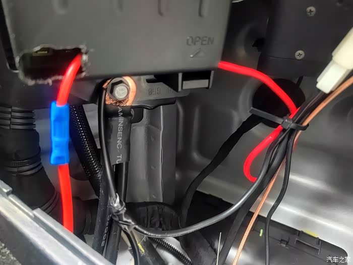 3,充电器负极搭铁在后备箱保险盒里。保险盒外壳开孔有点丑,别在意