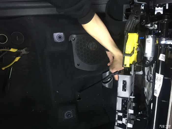 然后装上低音,再把座椅的螺丝固定上就可以。不需要拆除座椅,只是卸掉螺丝把座椅往后拨出去,漏出哈曼低音位置,安装上就可以了。