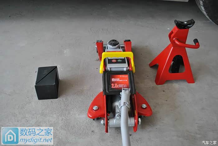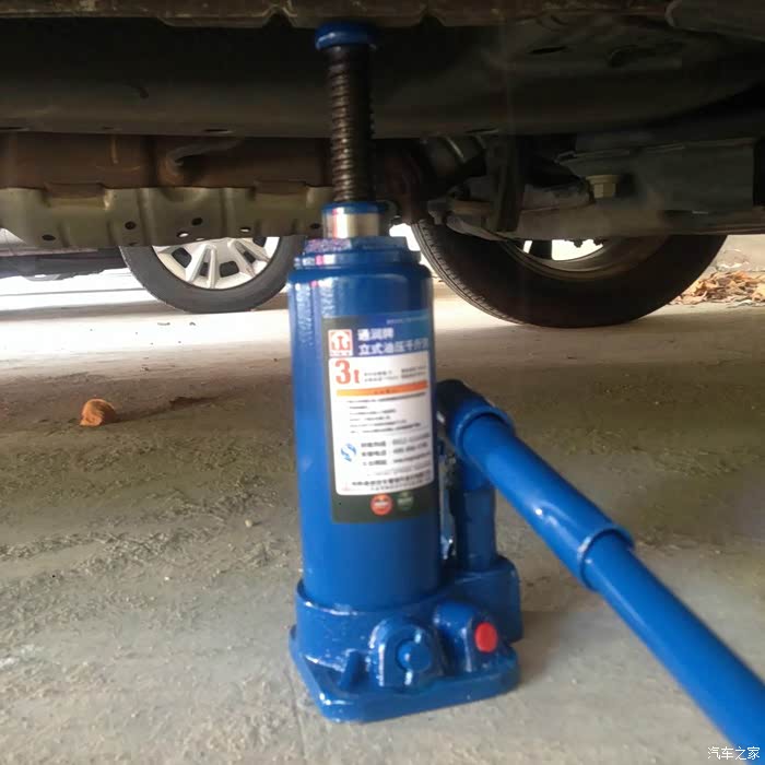 SUV离地间隙都高,就不用我那个低位的卧式液压千斤顶了,改用这个立式液压千斤顶,别看个头小,负荷极限也能3吨 。这辆SUV整车也就算它2吨,分配到一个轮子上就更没多少斤两了。