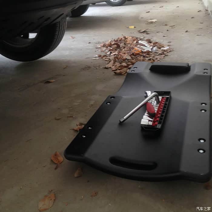 这次有了修车板,好快护板就下来了。真想在放油塞和机滤下方对应位置给它开2个大圆孔。
