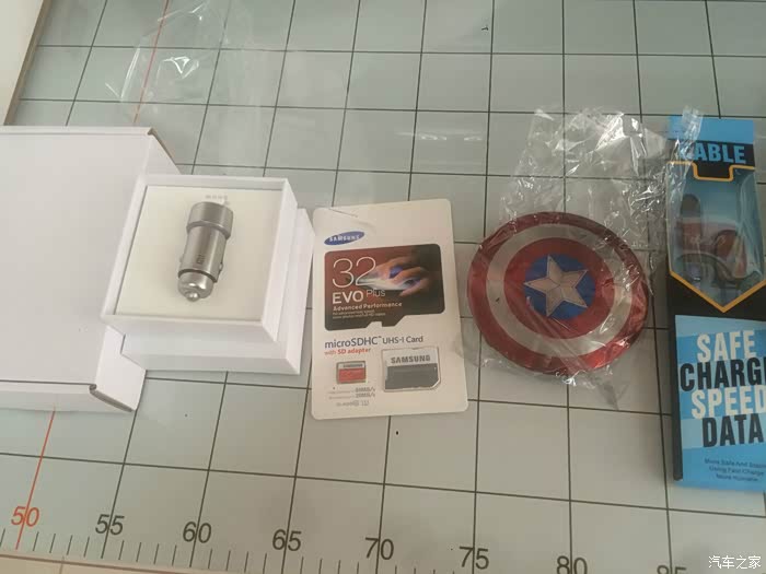 打包的东西总共这么多,除了导航,送了一个小米的双头车充(好用)三星的32G内存卡,美国队长的充电宝(金属的),以及一根苹果充电线(一般)