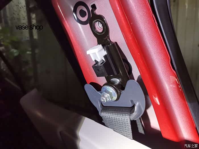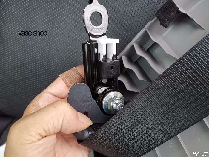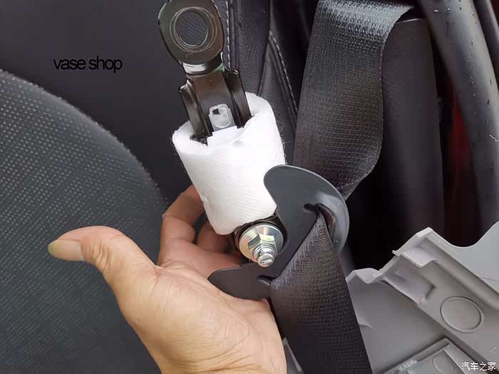 注意:此方法是阻挡异响,异响被闷在B柱里面了,人耳听不到了。对于更加强大的强迫症,建议用强力双面胶粘死这个调节滑块。从此杜绝了异响。(缺点是安全带无法上下调节了)。