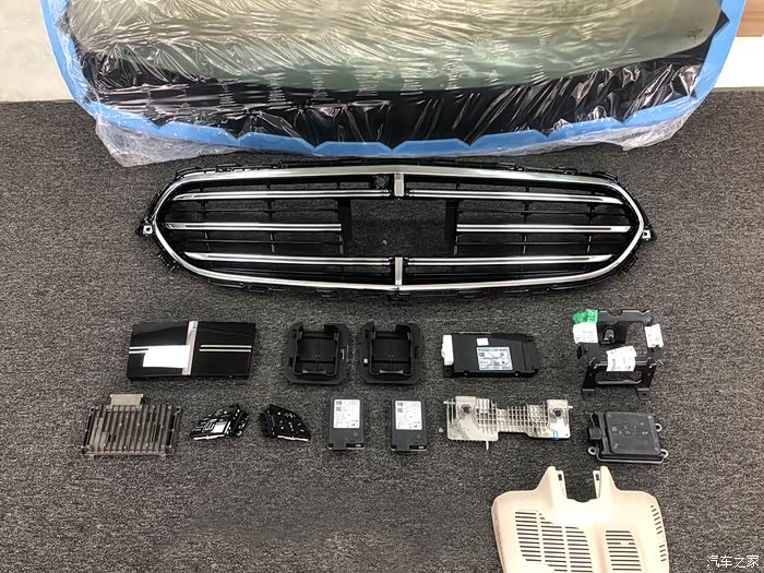 图中就是这台2021款奔驰E300L立标车型升级23P驾驶辅助需要更换的配件了,除了图中之外,还有一块高配的前挡风玻璃需要更换