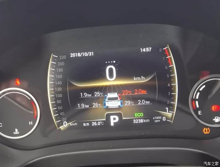 方向盘上的左右键,切换到胎压页面,如下图