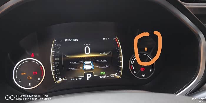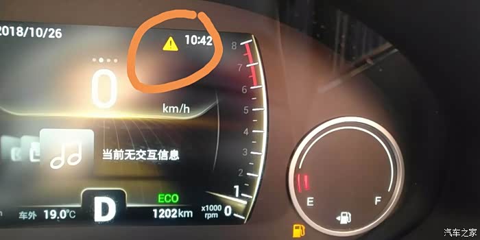 出现这个三角警报,这个警报有很多,需要具体切换到提示页才能知道,不过这张照片是油料不足了!提示你要加油了!具体切换还是方向盘左右键,如下图: