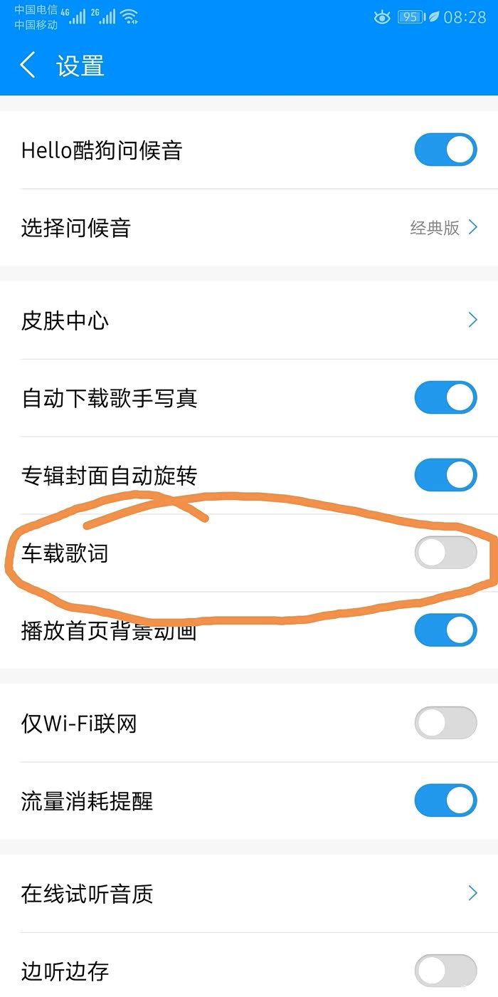 音乐播放如何播放歌词?答案是可以的,用蓝牙音乐播放,然后到酷狗音乐设置中把车载歌词打开,蓝牙播放方法请看该帖第3条问题,如下图