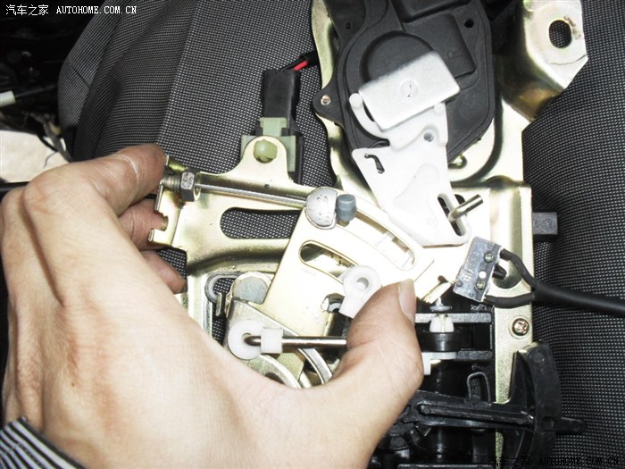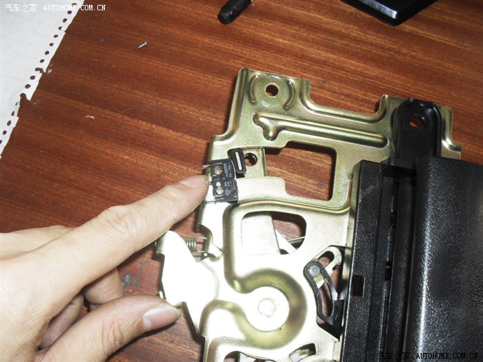 这是三个微动开关的接头,一个是检测中控锁的,一个是外拉手的,另一根是给电机复位的。因为这个是变速电机,在断电后还有惯性。还会再转一下才停,所以复位开关就装在这来检测,只要电机凸轮轴不停在杠杆的位置都可以。这里者是重点,,,,,,,