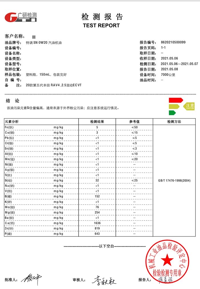 RAV混动7000公里废油全元素分析