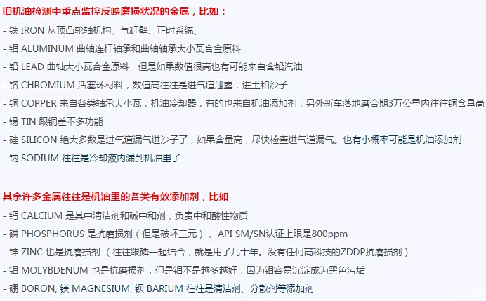 新机油中是没有特定的金属元素的,废油中的铁、铜、铝等元素的多少,直接反应了磨损程度,看一下7000公里的废油中各种元素的含量。