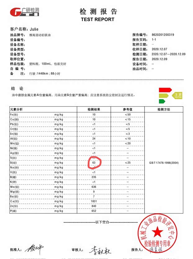 4.硅元素含量32ppm,参考值不高于25。硅元素超标。在过了磨合期的车辆中,硅元素通常来自空气中的微小砂石颗粒,硅元素超标说明空气过滤系统出现问题,空气滤芯过滤效果差或者未安装到位等。但对于新车,硅元素可能来自装配过程中使用的硅脂,过了磨合期或者使用一段时间,硅元素含量可能就回复到正常范围内了。在机油送检246篇,雅阁混动新车初装油的元素分析中,同样也是硅元素超标,所以很大可能就是来自装配用的硅脂。