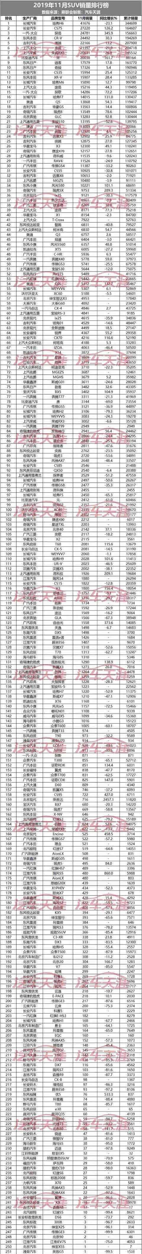11月SUV销量排行