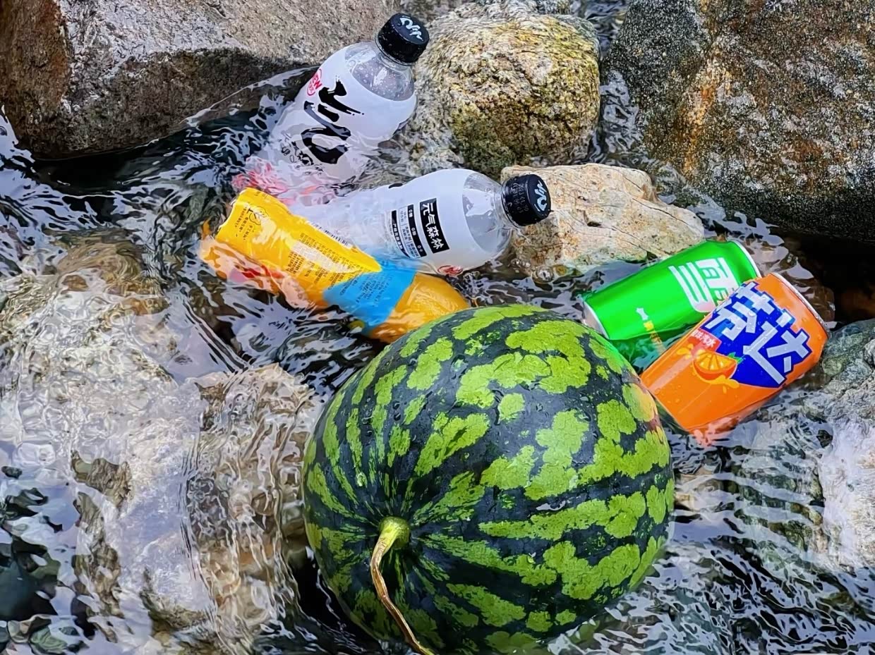出来避暑,西瓜和饮料放在河水里。这里的河水全是川西高原的冰川融水,水质非常好,而且水温沁骨,踩水、玩水非常适合。
