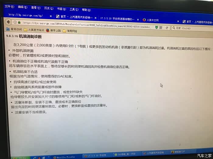 我是2015年3月买的2013款2.4君越,一直在4S店保养,使用银美浮机油,去年8月发过帖子,机油消耗非常严重。今年春节后44000公里时做过一次保养,保养后目前刚好跑了5000公里,机油寿命显示还有百分之54的寿命,可是机油尺抽出来,发现机油显示已经到麻点最低刻度的一半位置了,急忙联系4s店进行检查,举升架举起来观察发动机舱干净整洁,无漏油痕迹,打开节气门位置,这个地方干净无油污,轰油门闻尾气,无色无味,后来技师在电脑上查阅他们的维修手册,发现官方说的每3200公里机油消耗量不能大于0.9升,相当于1000公里不大于0.3升,我车子5000公里消耗1升机油,平均每1000公里消耗0.2升机油,技师判断应该正常