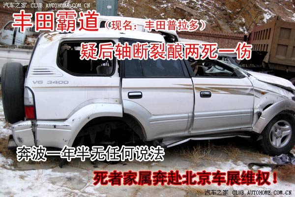 2008年10月28日下午3时许,一辆丰田霸道(现名为:丰田普拉多)3400正常行驶在开往内蒙古包头市达茂旗的公路上,行至S211公路158公里处,突遇车辆后轴断裂,车辆失控翻滚后造成车上3名驾乘人中2死一伤的严重后果。交警案卷记载显示:天气晴朗,***无云,视野开阔,路面无异物,未与其他车辆发生碰撞,驾驶员没有饮酒。