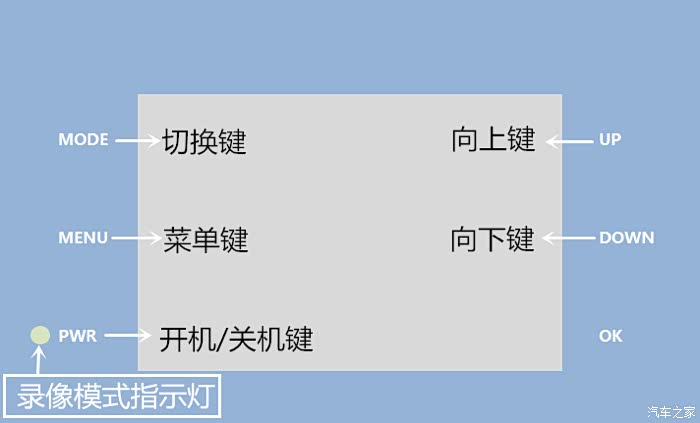 MODE键:按动可在录像、拍照、回放三种模式间切换。录像状态下,短按可以手动开启强制保存功能。MENU键:按动可以进入设置页面。录像状态:短按可以开启或者关闭录音。PWR:开机/关机键,开机状态下长按可关机。向上键:向上选择,1/2/3/4倍变焦(放大)。向下键:向下选择,4/3/2/1倍变焦(缩小)。OK键:设置模式下为确定键。录像状态下,按动可以暂停录像或者开启录像。