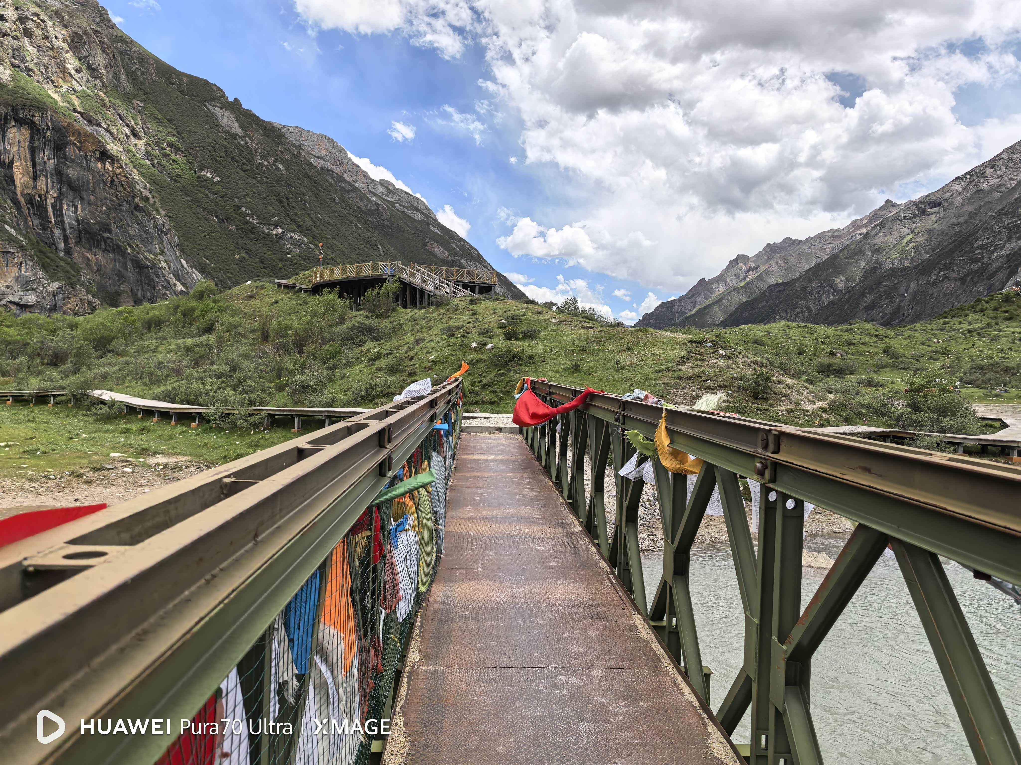 我们沿着冰碛湖往河的下游走去,发现了一座铁桥。