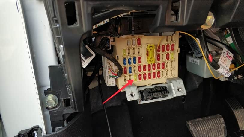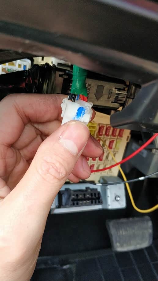 侧视触发线和电源线接一起,然后共用一根线拉到左侧保险丝和这里,接一根12v正极电源,视屏输AV莲花插头一端接摄像头,一端拖到中控处。